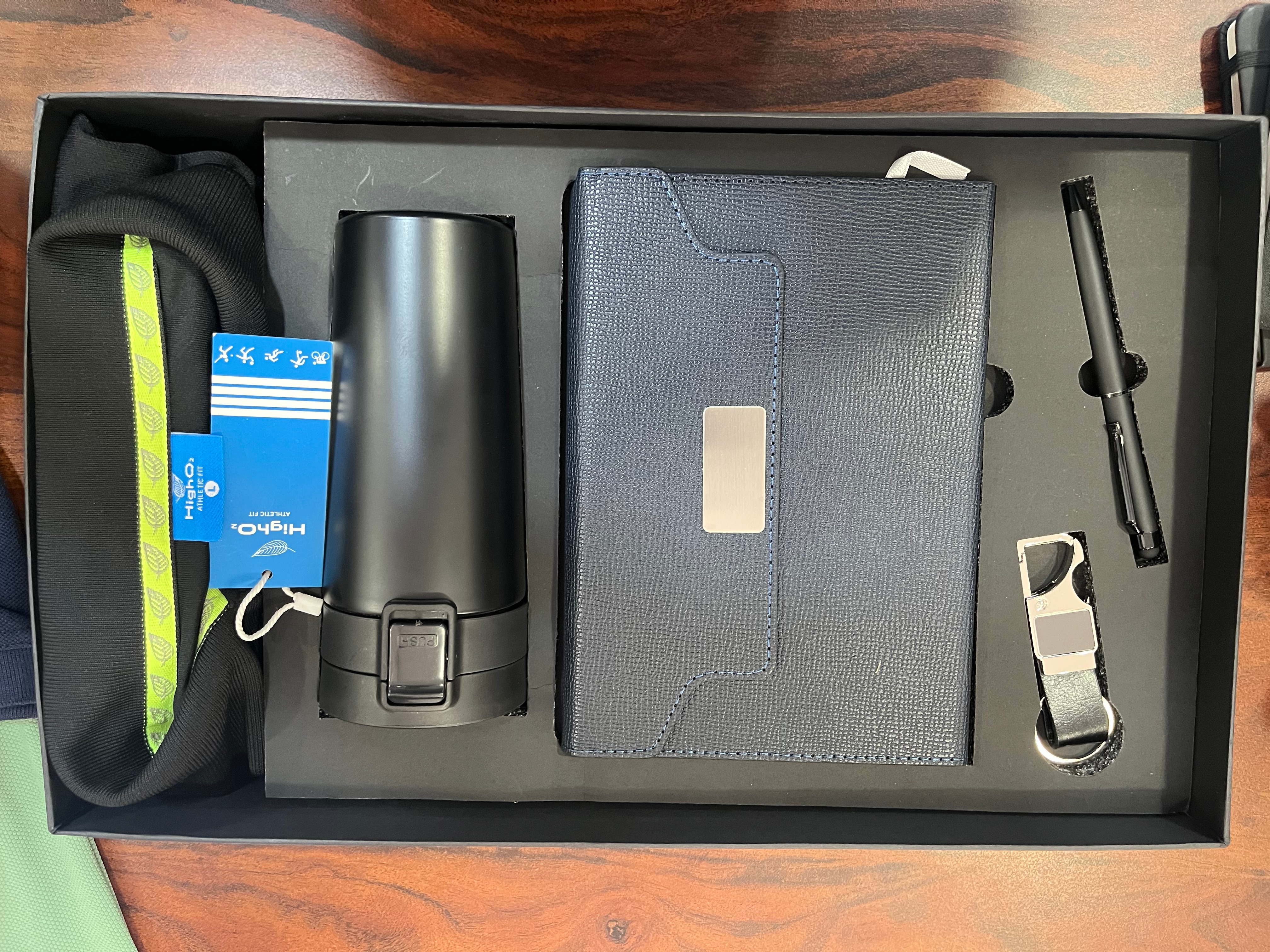 Corporate combo gift with sturdy box including T-shirt,Dairy,Bottle-or Tumbler , pen, Keychain, mobile stand, card holder. With customised branding in printing, laser engraving.